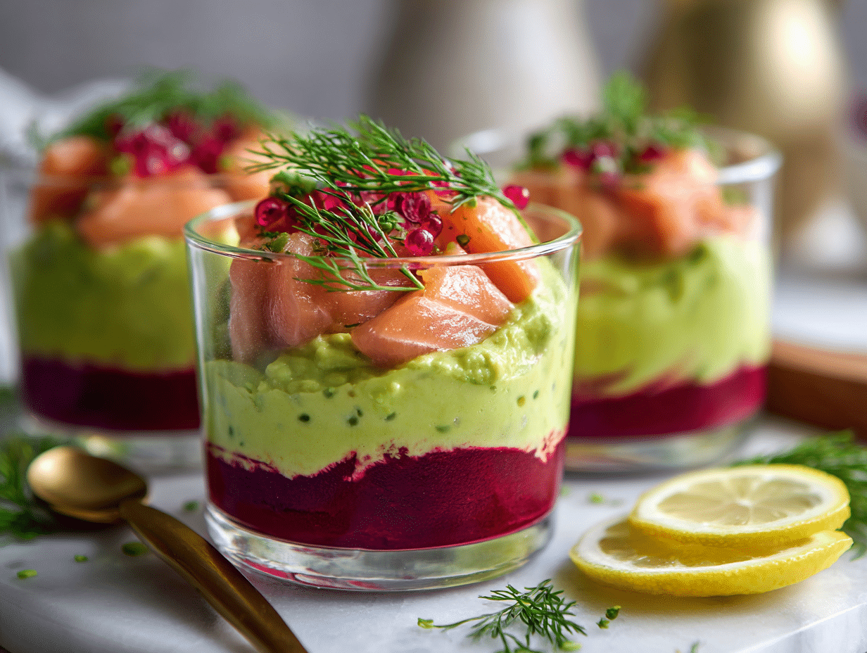 - Versez un peu de purée de betteraves dans le fond des verrines, puis l’avocat et enfin le saumon fumé.